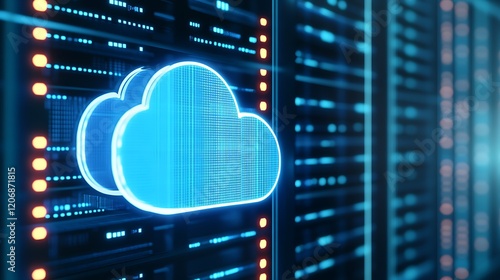 Bright Blue Cloud Symbol Glowing Among Digital Server Racks Representing Cloud Computing and Data Storage Systems