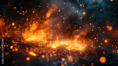 Bright fire burning. Flames glow in dark. Abstract fiery particles fly around. Intense heat rising up. Orange light sparks in air.