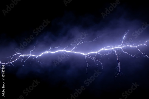 Bright lightning bolt strikes through dark, stormy clouds with smoke effect