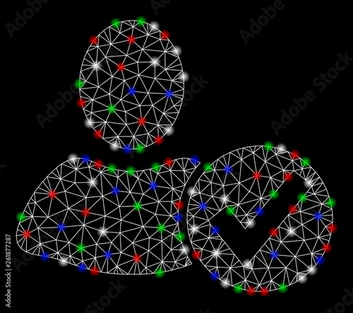 Bright mesh apply user with glare effect. White wire frame triangular mesh in vector format on a black background. Abstract 2d mesh built from triangular lines, round dots, colorful glare spots.
