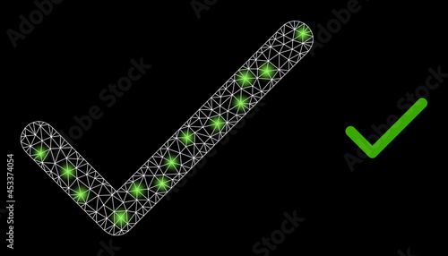 Bright mesh vector apply tick with glare effect. White mesh, glare spots on a black background with apply tick icon. Mesh and glare elements are placed on different layers.