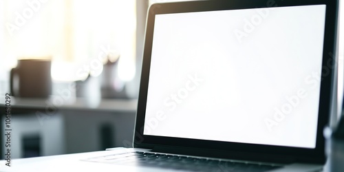 Bright office laptop with blank screen, workspace setup
