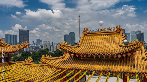 Bright tiled roofs of a Chinese temple against the city skyscrapers, blue sky, clouds. Traditional red and yellow lanterns are suspended along the curved edges. Figures of mythical creatures