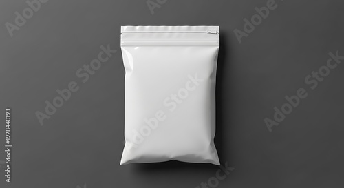 Bright white, sealed, rectangular pouch/bag with zipper, on a plain gray backdrop