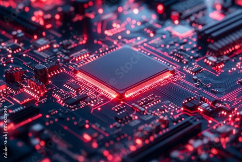 Brightly lit circuit board with microprocessor glowing in vibrant red hues at close range