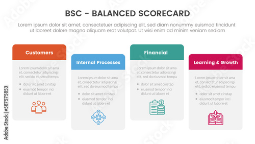 bsc balanced scorecard strategic management tool infographic with round box right direction concept for slide presentation