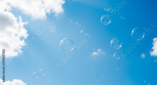Bubbles float in a bright blue sky with fluffy white clouds, illuminated by sunlight.