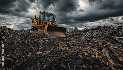 Bulldozer amidst Demolished Structure under a Stormy Sky