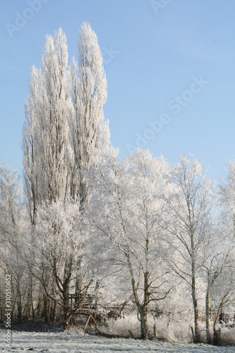 Bäume im Winter mit Eis auf Ästen, Himmel blau