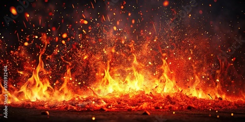 Burning red hot sparks rise from large fire with fiery orange and red glowing ember particles , bonfire, sparks, fire, flames, heat, light