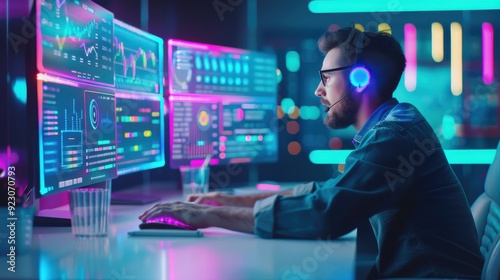 Business analyst at a sleek desk, viewing detailed KPI dashboards, soft neon lighting, modern, 3D illustration