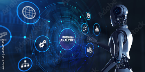 Business analytics automation concept. Robot pressing button on screen 3d render.