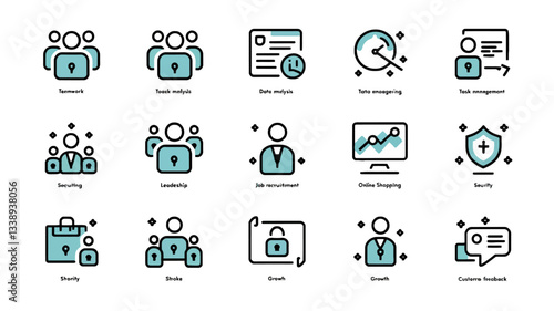 Business and Management Icons - Data Analysis, Leadership, Strategy, Planning, Teamwork, Marketing, and Financial Growth Vector Set