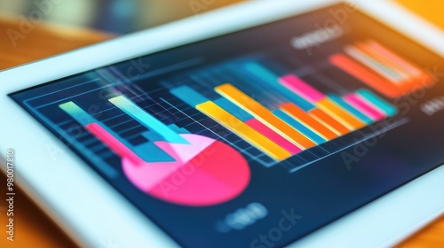 Business charts and graphs with colorful bar graphs and pie charts on a modern digital tablet display