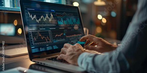 Business data analytics dashboard. Data management system. Data scientist analyzing data on laptop