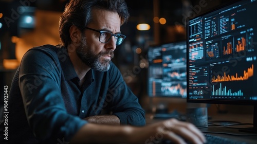 Business development analyst working on financial projections and reports in a modern office with high-tech computer setup, creating a focused and tech-driven environment.
