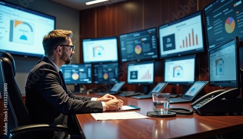 Business executive reviewing multiple data screens in command center for corporate strategy presentations