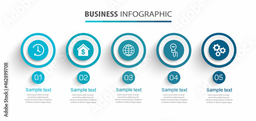 Business infographic design template with 5 options, steps or processes. Can be used for workflow layout, diagram, annual report, web design