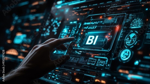 Business Intelligence performance A hand engaging with a futuristic "BI" interface