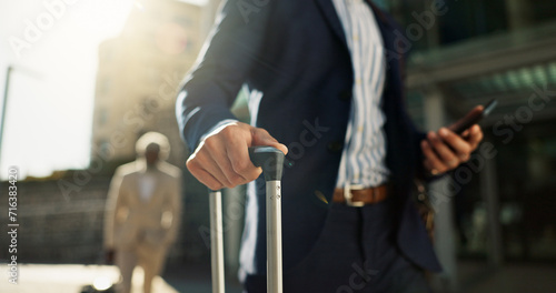 Business man, phone and suitcase in street, hands and search for location, travel and transport to airport Corporate employee, smartphone and walk with baggage, luggage or urban sidewalk in Cape Town