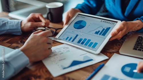 Business people are discussing financial data and holding charts on a tablet computer for a strategy meeting in the office.
