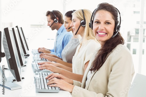 Business people with headsets using computers in office