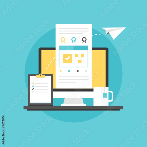 Business planning icon concept. Computer with business calendar and clipboard in flat design style. Vector illustration