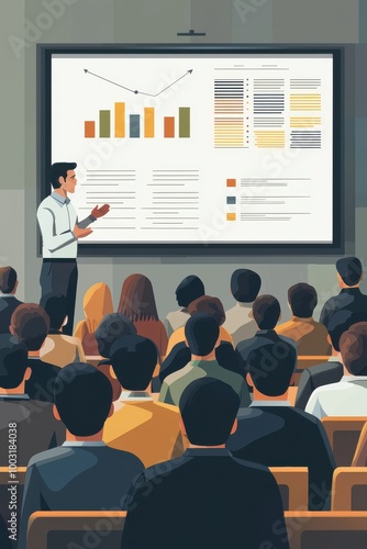 Business presentation with professional audience and speaker showcasing charts and data on a large screen in a modern conference room setting