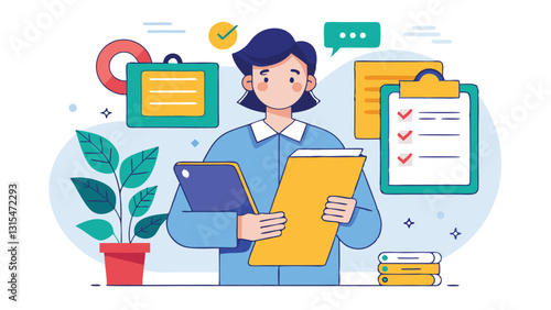 Business professional holding a clipboard with documents in a modern office environment surrounded by plants and organizational tools