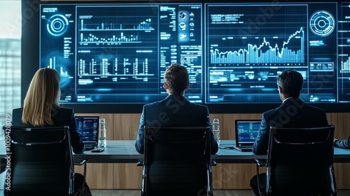 Business Team Analyzing Data on Large Screen, Three Businesspeople, Data Visualization, Financial Reports, Business Strategy, Data Analytics, Data Science