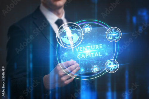 Business, Technology, Internet and network concept. Young businessman working on a virtual screen of the future and sees the inscription: Venture capital