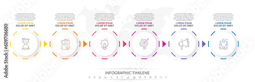Business vector infographics with six circles and arrows. Timeline visualization with 6 steps for diagram, flowchart, banner, presentations, web, content, levels, chart, graphic