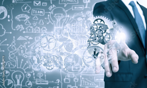 Businessman activating gears mechanism