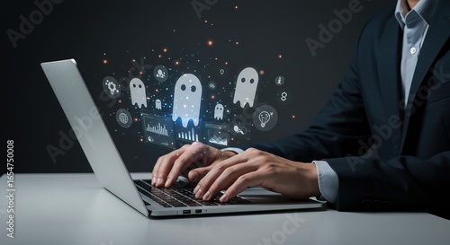 Businessman analyzing digital data with futuristic ghost interface and glowing network connections