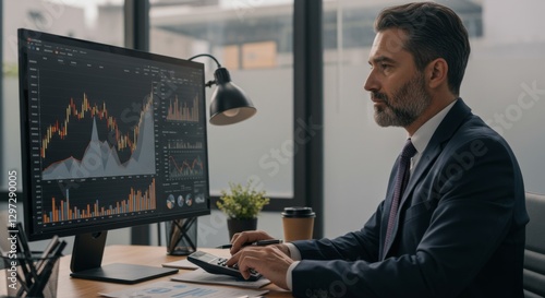 Businessman Analyzing Financial Data and Sales Growth Charts on Computer Screen in Modern Office Setting