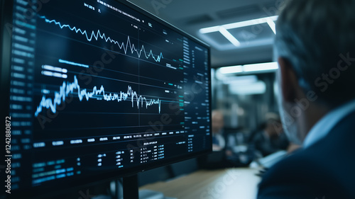 Businessman analyzing stock market data on large monitor.
