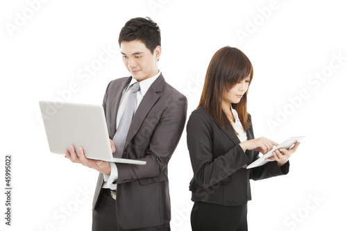 businessman and businesswoman using laptop and tablet pc