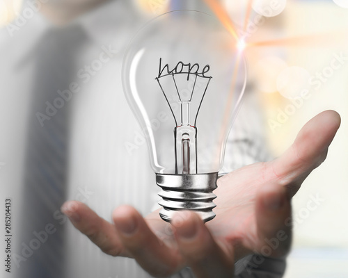 Businessman hand holding light bulb with hope word wire shape, front view, blur background.