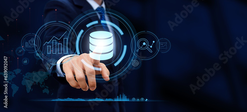 Businessman Hands touching the big data icon. Business analytics Big data analysis technology future concept on VR screen on blur background.