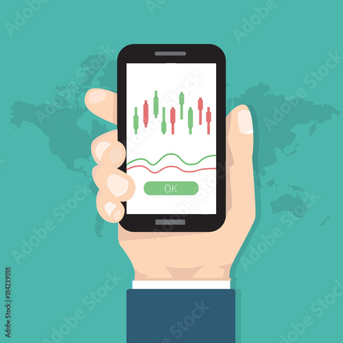 Businessman hold smartphone with candlestick chart app. Vector illustration.