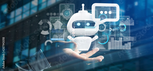 Businessman holding Chatbot with binary code, message and data 3d rendering
