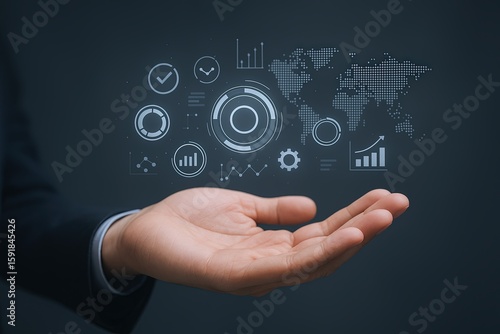 Businessman Holding Digital Interface with World Map and Data Charts in Hand.