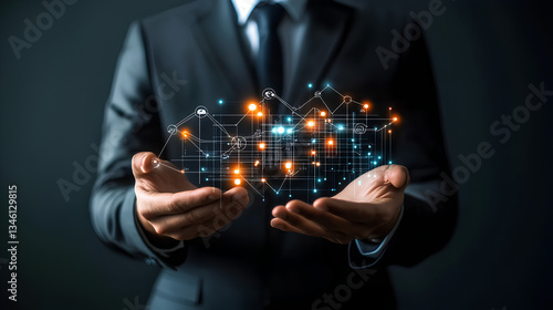 Businessman holding Enterprise Resource Planning (ERP) software, optimizing organizational efficiency and integrating core business functions seamlessly
