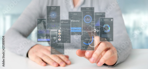 Businessman holding User interface screens with icon, stats and data 3d rendering