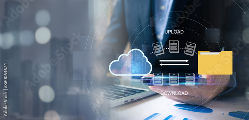 Businessman hosting Cloud technology. Data storage. Networking and internet service concept. DMS Cloud computing and database information technology server, upload and download.