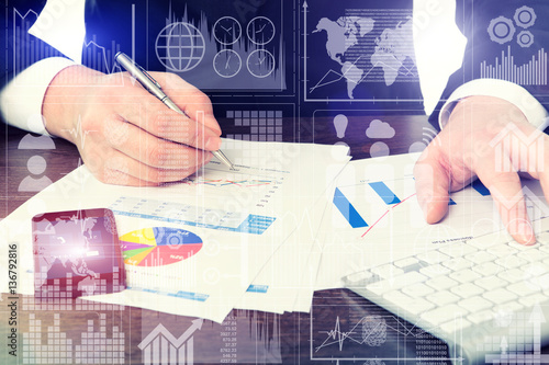 businessman in office with graphics and phone drawing business c