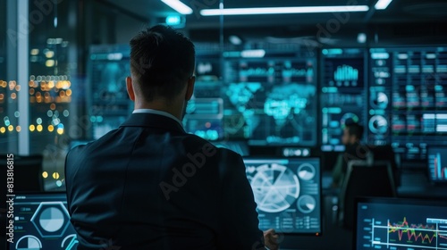 Businessman in suit analyzing data on multiple computer screens in office environment