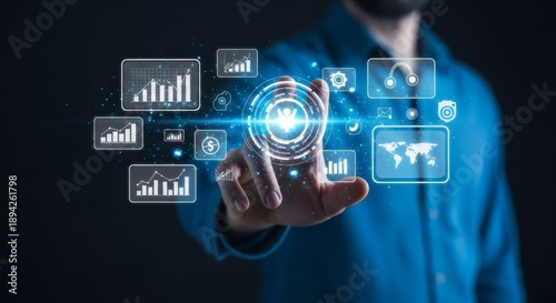 Businessman interacting with digital data interface.