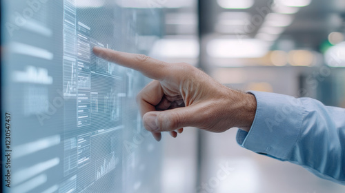 Businessman is interacting with a transparent holographic screen displaying various data and charts, suggesting a futuristic approach to data analysis and management in a modern office setting