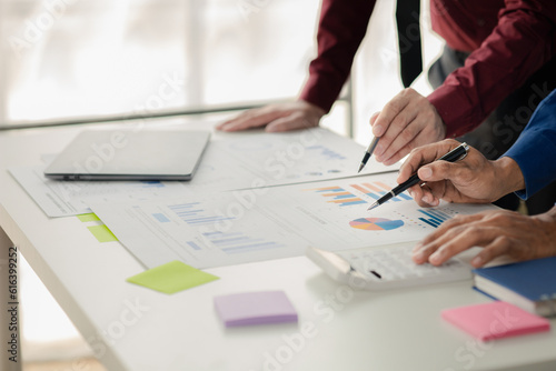 Businessman is reviewing monthly sales documents for analysis and marketing plans for more sales growth, they are the founders of young companies co-founding startups. Sales management concept.